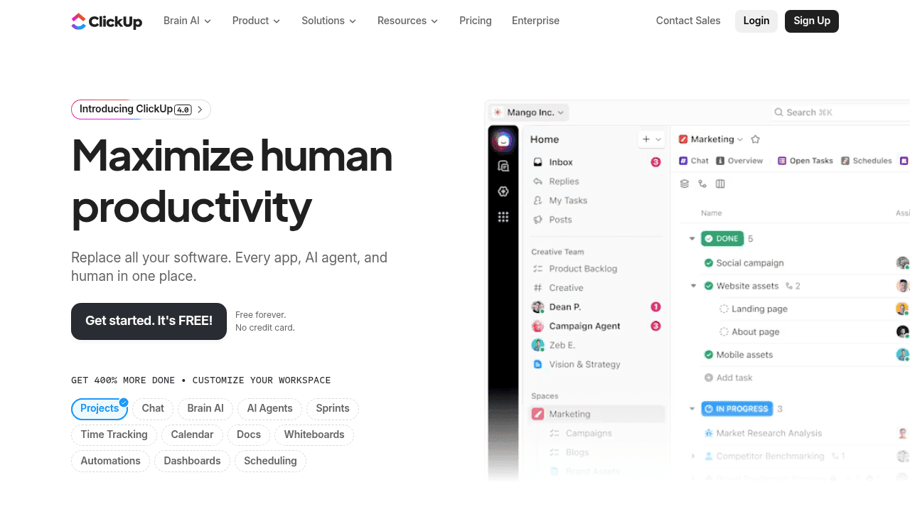 ClickUp brings together task and project management, documentation, goal tracking, time tracking, dashboards, and automation in a single platform. It functions as a pre-built internal workflow tool centered on driving tasks to completion.